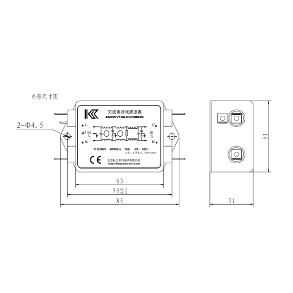 AC250V10A-C30K003B 交流单相、双共模+差模,高性能-C3系列